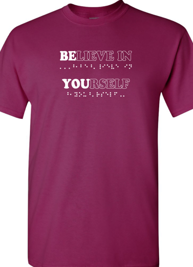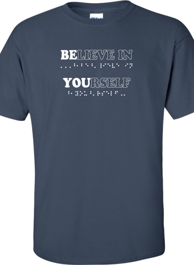 In both print and braille shirt says BELIEVE IN YOURSELF with BE YOU in bold.